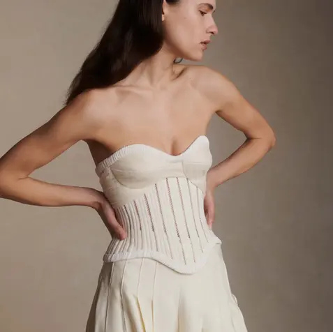 Lace and piped cotton twill basque waisted bodice. Exaggerated soft tulle, pleated streamers at bust and full hook and eye closure at back.