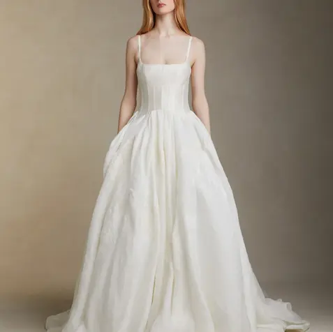 Silk wool twill square neckline gown with external boning at the bodice. Silk linen organza bubbled skirt with hand cut Lyon, Chantilly, and corded lace applique. Invisible zip closure at center back.